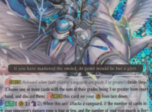 Vanquisher’s Stride skill binds a card from your opponent’s drop zone and you may bind a rear-guard if your new G-Unit has the Thunderstike ability. Your opponent chooses the rear-guard to bind, but at least you are removing a unit from the field. Always stride a G-unit with the Thunderstrike ability. You want to maximize your card’s potential. This strategy quickly enables Thunderstrike 4. The skill is really cheap for a huge advantage. You only pay one counter blast for the skill.
