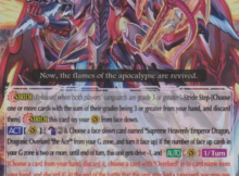 His skill supports the Darkness ability. He soul charges three cards and gives 5,000 power for each sent to the soul to a rear-guard. You may draw a grade three card from the soul if you soul charged a card with Darkness. The grade three card from the soul is very useful. You may save it to use to pay for your next stride. You are gaining resources instead of losing key cards in the soul.