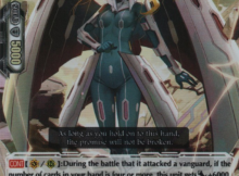 Promise Daughter cannot be retired by your opponent’s card effects. This skill is fantastic to counter Kagero and Shadow Paladins. The most notable card that you can counter is The Dark Dictator. You may choose which card to be retired and you may choose Promise Daughter. Promise Daughter will deny The Dark Dictator’s orders to execute her, and you will not be forced to retire any rear-guards.