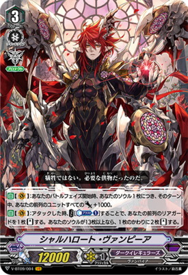 [ACT](VC)1/Turn:COST [Counter Blast (1) & retire a rear-guard], look at five cards from the top of your deck, call up to two cards from among them to (RC), and shuffle your deck. If your soul has a grade 3, call up to three cards instead of two, and three units in your front row get [Power]+10000 until end of turn.