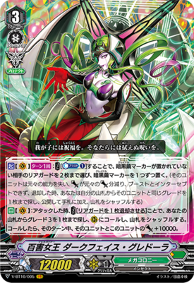 Evil Governor, Darkface Gredora is the queen of Megacolony. She is the mother for every member in the clan. Evil Governor, Darkface Gredora is one of the six apostles of Gyze. Her ultimate goal is to be the mother of the new world. Evil Governor, Darkface Gredora uses her two abilities to govern the rules of Cardfight!! Vanguard and dominate the competition.