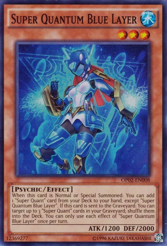 Super Quantum Blue Layer is a member of the Super Quantums. This effect monster is a psychic with 1,200 ATK and 2,000 DEF. This effect monster has two effects and the attribute of water. It adds consistency to the deck with its effects. It is also material for the archetype’s monsters from the extra deck.